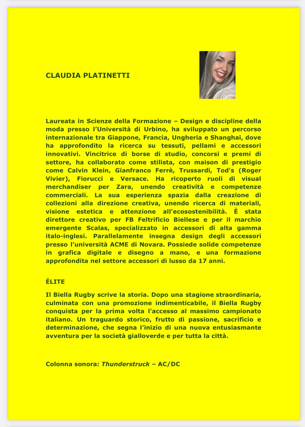 Laureata in Scienze della Formazione - Design e discipline della moda presso l'Università di Urbino, ha sviluppato un percorso internazionale tra Giappone, Francia, Ungheria e Shanghai, dove ha approfondito la ricerca su tessuti, pellami e accessori innovativi. Vincitrice di borse di studio, concorsi e premi di settore, ha collaborato come stilista, con maison di prestigio come Calvin Klein, Gianfranco Ferrè, Trussardi, Tod's (Roger Vivier), Fiorucci e Versace. Ha ricoperto ruoli di visual merchandiser per Zara, unendo creatività e competenze commerciali. La sua esperienza spazia dalla creazione di collezioni alla direzione creativa, unendo ricerca di materiali, visione estetica e attenzione all'ecosostenibilità. È stata direttore creativo per FB Feltrificio Biellese e per il marchio emergente Scalas, specializzato in accessori di alta gamma italo-inglesi. Parallelamente insegna design degli accessori presso l'università ACME di Novara. Possiede solide competenze in grafica digitale e disegno a mano, e una formazione approfondita nel settore accessori di lusso da 17 anni.